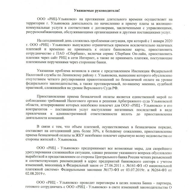 С 1 января 2020 года ООО «РИЦ-Ульяновск» приостанавливает сотрудничество со всеми банками, включая Сбербанк.Онлайн. Безналом в Ульяновске совершается около 30% платежей.