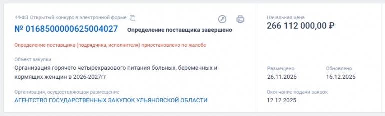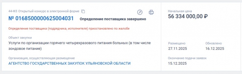 По словам источника 73online.ru, знакомого с ситуацией, «Континент-Кулинария» может выиграть два свежих «питательных» конкурса, проходивших с середины ноября до середины декабря — контракт на ₽266,1 млн с Ульяновской областной клинической больницей на организацию горячего четырехразового питания больных, беременных и кормящих женщин в 2026-2027 годах и контракт по питанию больных Барышской районной больницы на ₽56,3 млн. Обе больницы раньше кормил «Комбинат социального питания».