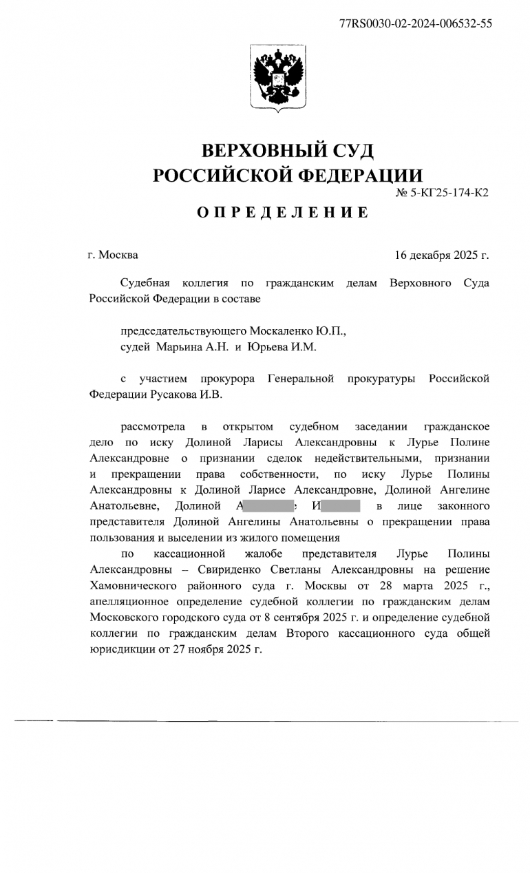 Несмотря на то, что Лариса Долина считала сделку фиктивной, она не могла претендовать на квартиру — постановил Верховный суд. При этом Фемида установила добросовестное поведение Полины Лурье. Опыт и уровень познаний Долиной должен был ей позволить ей осознать правовых последствий договора, следует из постановления.