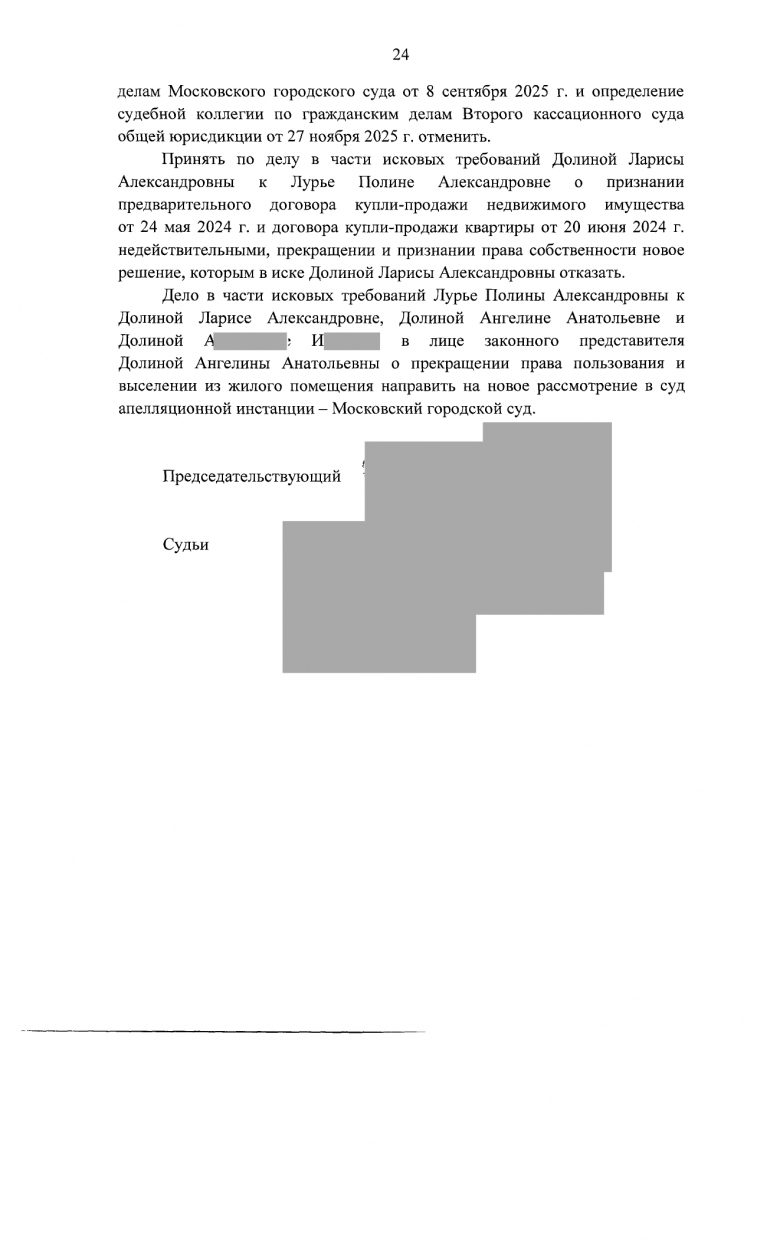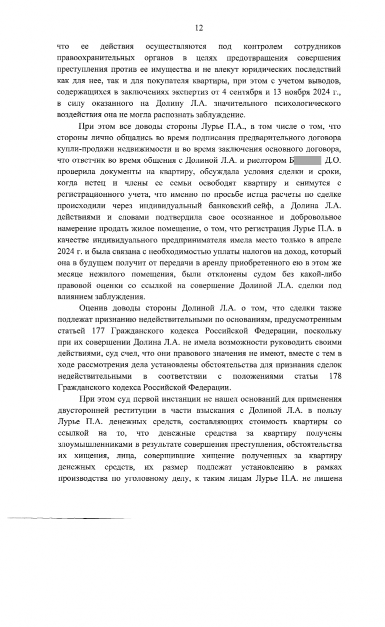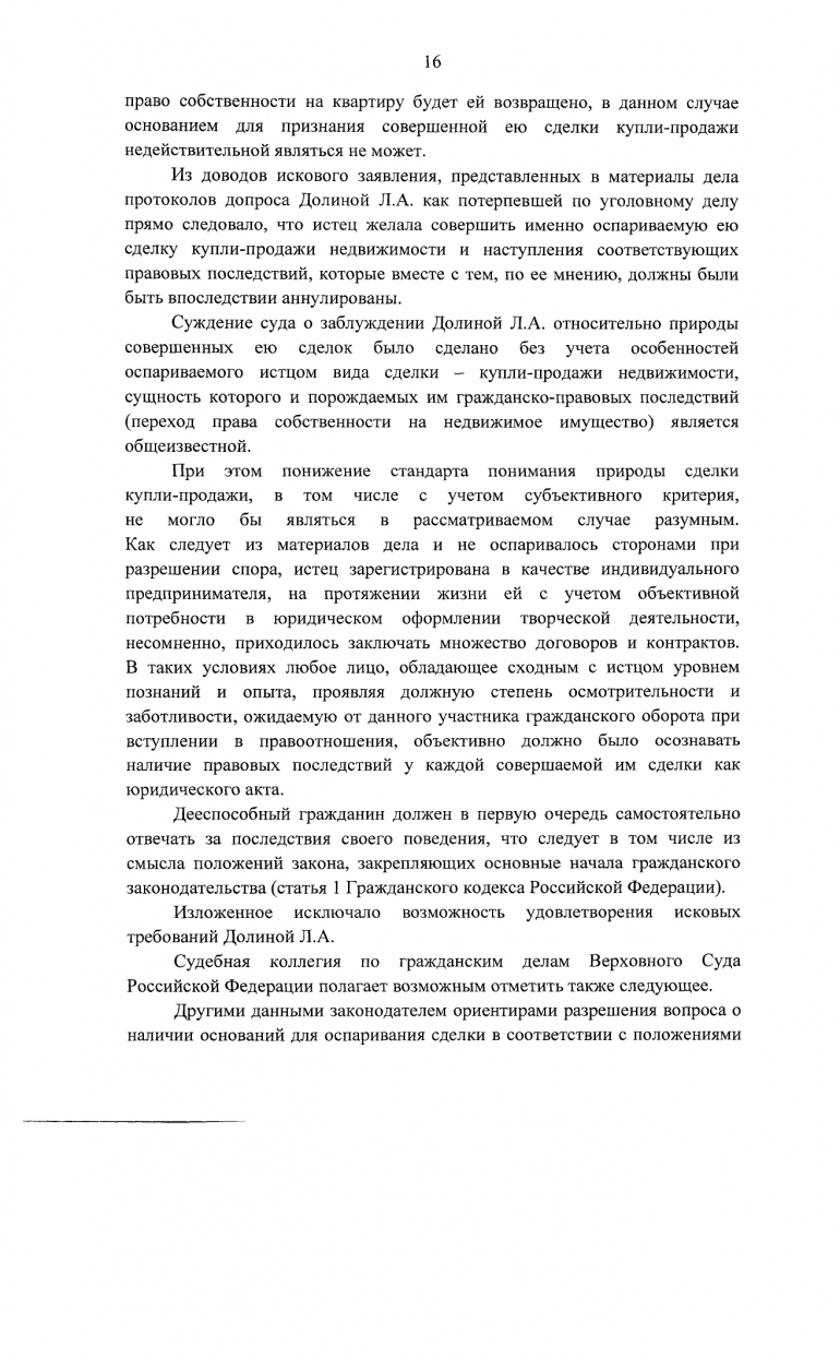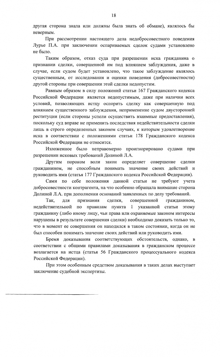 Также в решение сказано, что заблуждение Долиной касалось только причин сделки, а не ее законности, поэтому отменять покупку нижестоящие суды не имели права и все их решения признаны недействительными. Поскольку, допустив ошибку в толковании положений статьи 178 Гражданского кодекса Российской Федерации, суд первой инстанции не применил пункт 3 указанной статьи, исключавший в настоящем деле признание оспариваемых истцом сделок недействительными.