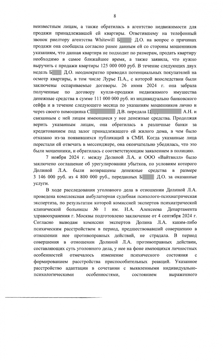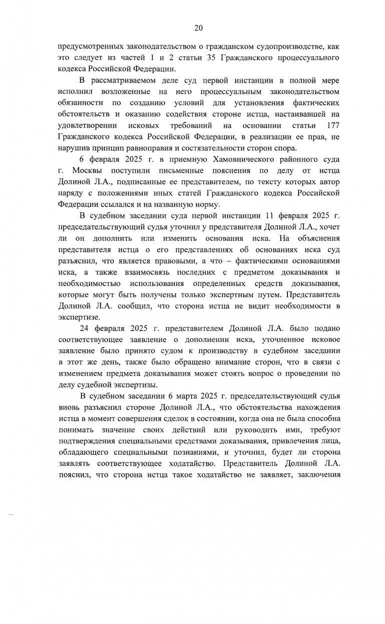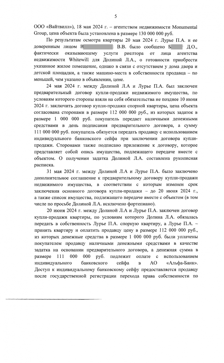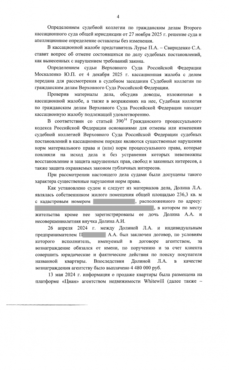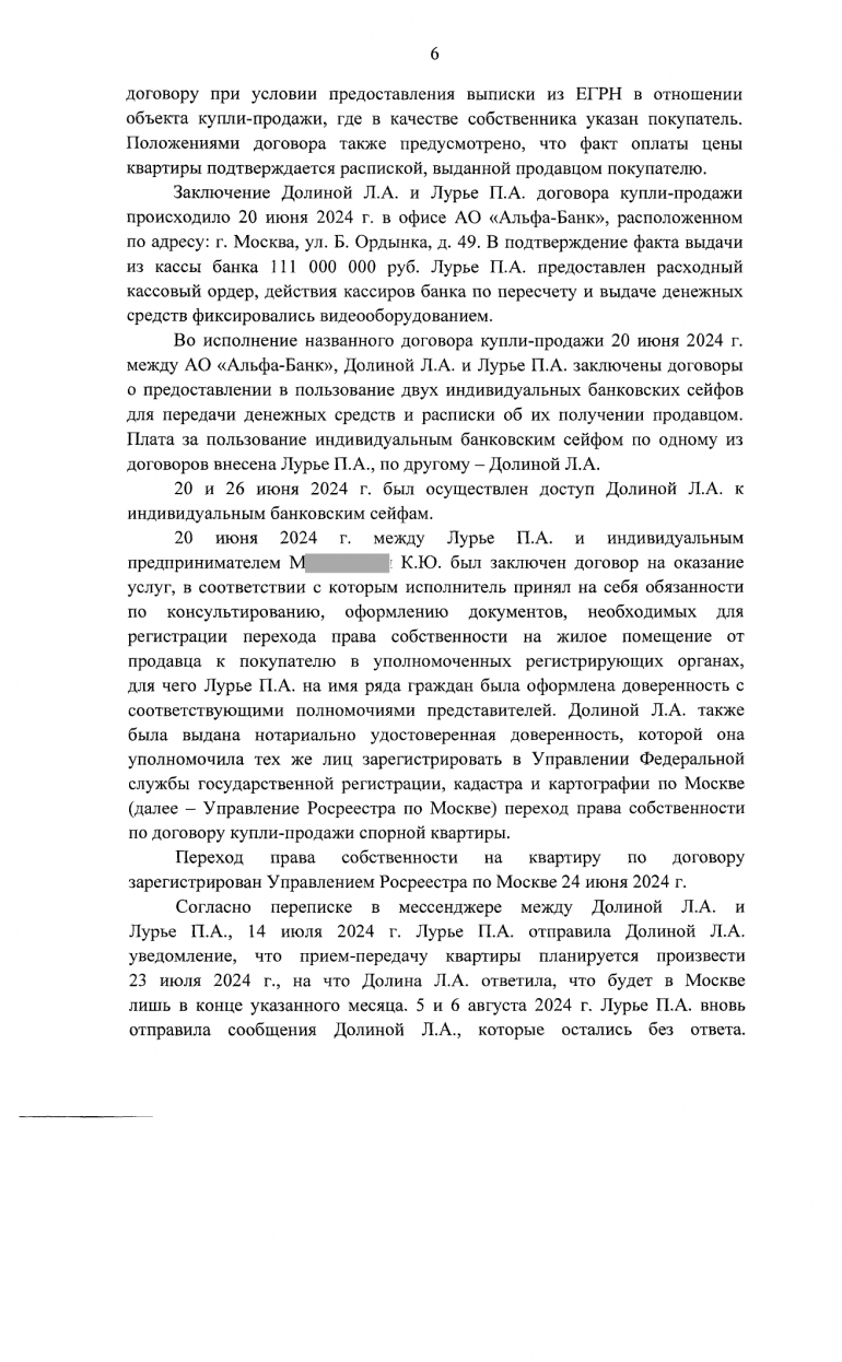 Также в решение сказано, что заблуждение Долиной касалось только причин сделки, а не ее законности, поэтому отменять покупку нижестоящие суды не имели права и все их решения признаны недействительными. Поскольку, допустив ошибку в толковании положений статьи 178 Гражданского кодекса Российской Федерации, суд первой инстанции не применил пункт 3 указанной статьи, исключавший в настоящем деле признание оспариваемых истцом сделок недействительными.