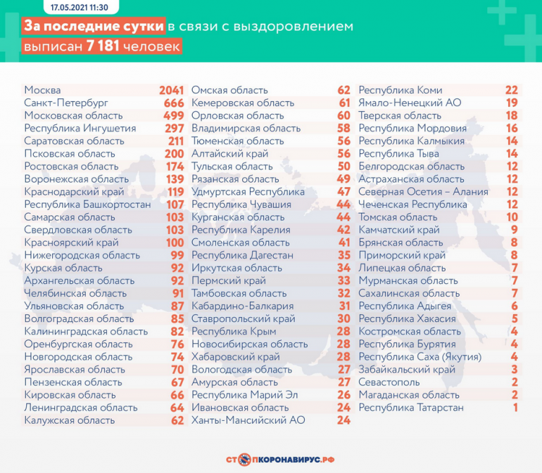 В целом по стране зарегистрировано 4 949 573 случая коронавирусной инфекции, число выписанных пациентов выросло до 4 563 254, умерло за всё время 116 211 человек.
