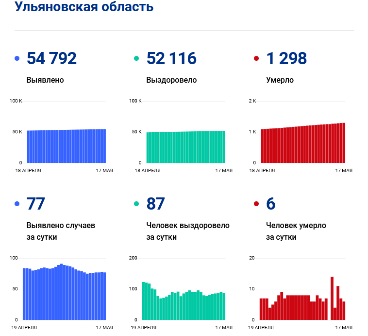 По данным федерального оперативного штаба на сегодня, 17 мая, за сутки в Ульяновской области подтвердилось шесть смертей от коронавируса, выздоровело 87 человек.