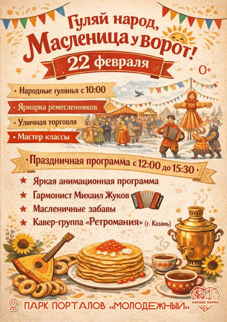 22 февраля с 10:00 парк Молодежный ждет всех на народные масленичные гуляния мастер классы,ярмарку ремесленников, катания на лошадях.