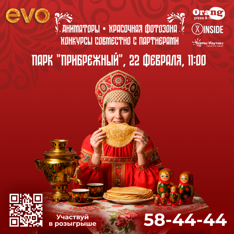 22 февраля в 11:00 в парке «Прибрежный» гостей ожидают: аниматоры, фотозона, конкурсы и подарки.