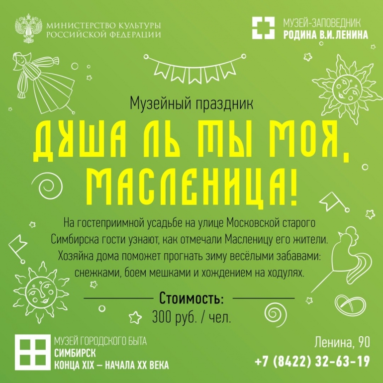 В первой частной типографии старого Симбирска участники узнают о народных обрядах: почему блин — это солнце, зачем сжигают чучело. Потанцуют, споют и поиграют под живую музыку с талантливыми ведущими!
