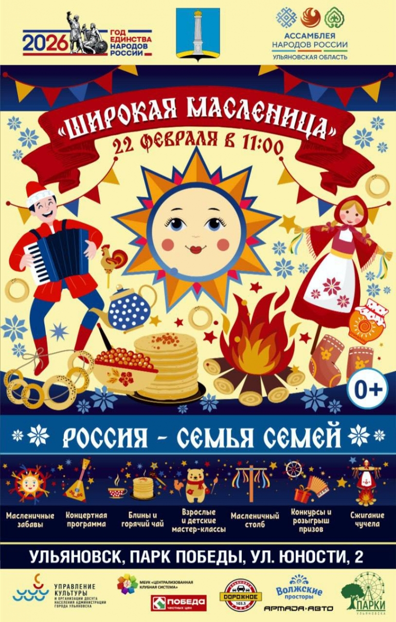 21–22 февраля в Ульяновске: сутки общего праздника для детей и взрослых: пир на весь мир, мастер-классы, уличные забавы, детская игровая, вечернее шоу, дискотека и сжигание чучела.