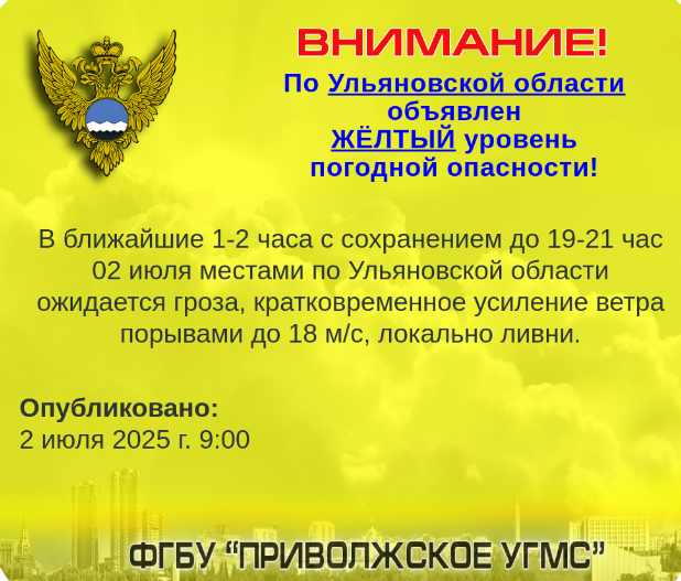 Сегодня, 2 июля, в ближайшие один - два часа с сохранением до 19:00 – 21:00 местами на территории Ульяновской области ожидается гроза и ливни.