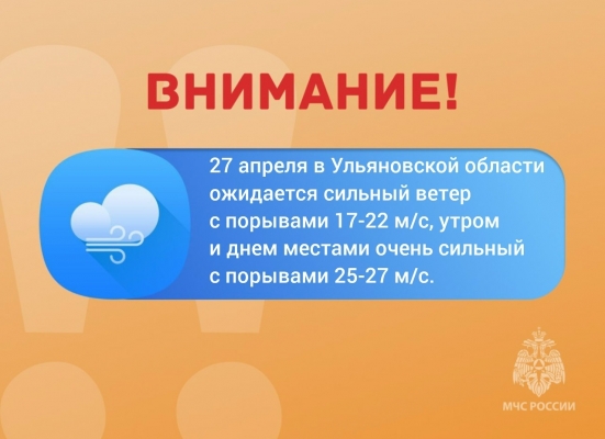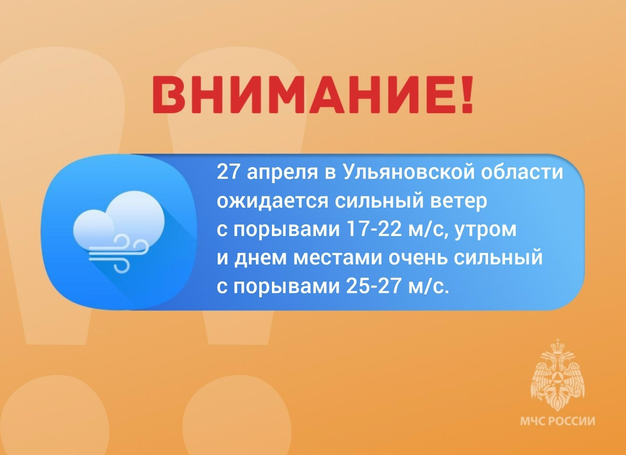 В понедельник, 27 апреля, в регионе объявлен «оранжевый» уровень погодной опасности. Синоптики предупреждают об экстремальном усилении ветра, порывы которого могут достигать разрушительных значений.