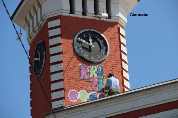 Работники музея тут же забрались на крышу ульяновского "Биг Бена", как его называют горожане, пытаясь ликвидировать художества местного Бэнкси (псевдоним английского андеграундного художника стрит-арта - прим. ред.).