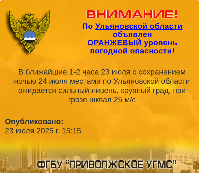Сегодня, 23 июля, в ближайшие один – два часа на территории Ульяновской области ожидается сильный ливень, крупный град и гроза.