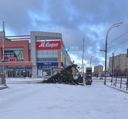 Из-за сильного ветра у ТЦ «Самолет» упала новогодняя ёлка. Она сломала шлагбаум.