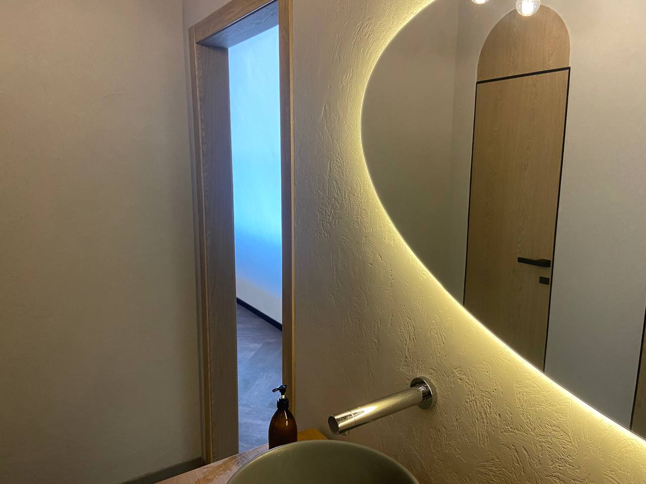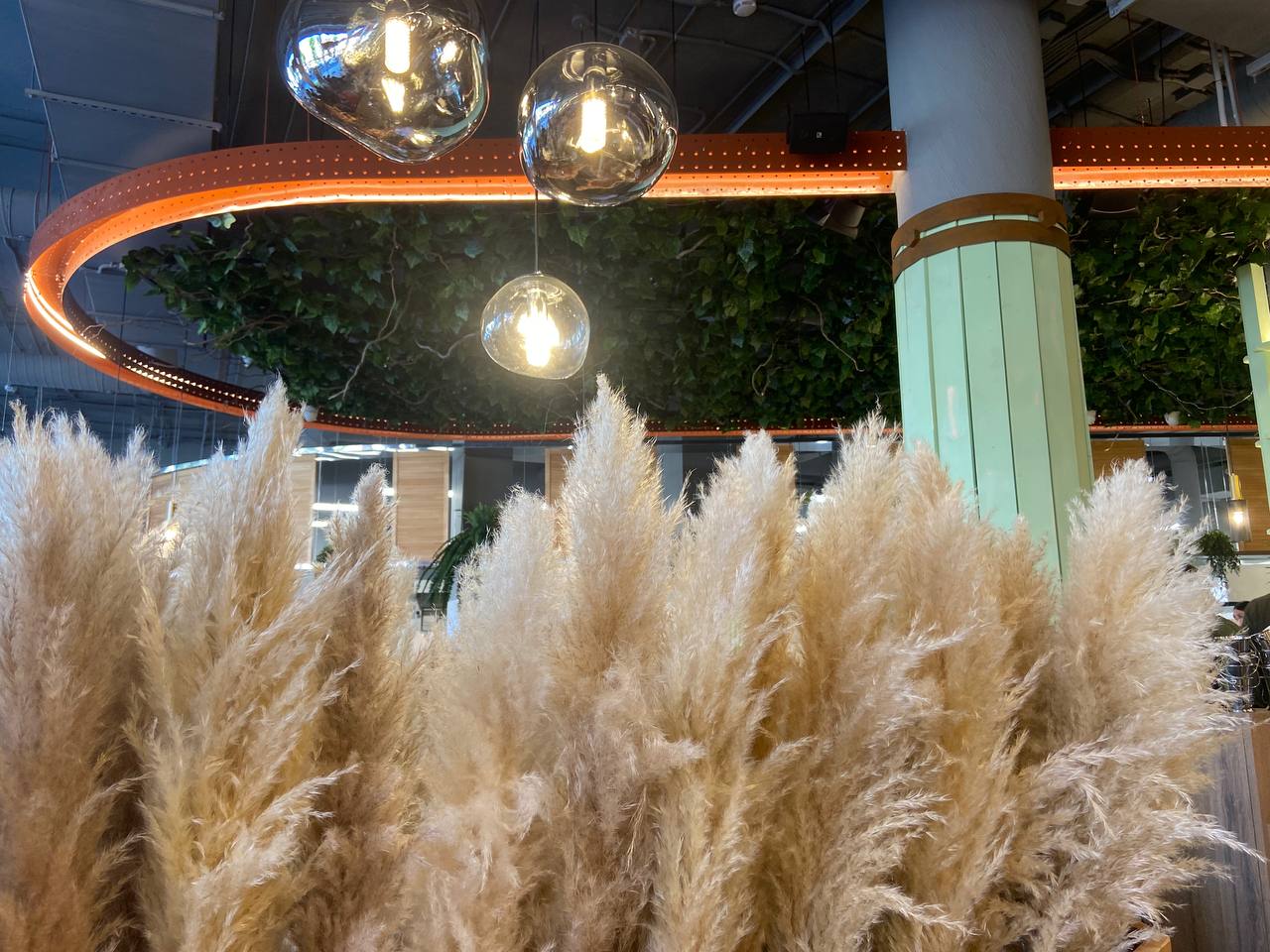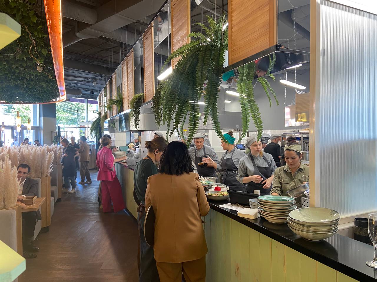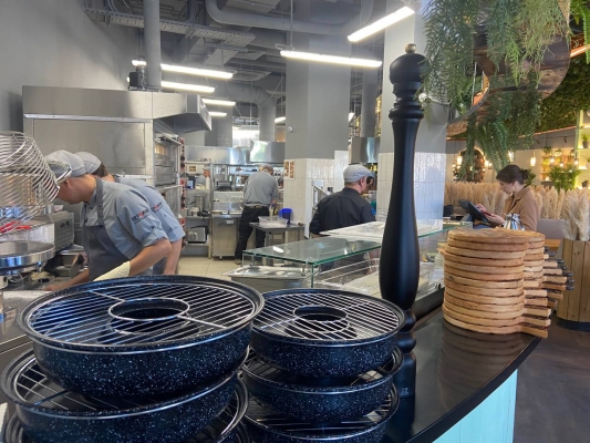 Первое, что бросилось в глаза на входе - это большая открытая кухня и много зелени. Обстановка уютная, среди персонала в основном молодые девушки. Ресторан занимает 450 квадратных метров, и если в «Чико» столики у окон доступны только по лицевой стороне отеля, то в «Перчини» - по обе. Открытая кухня выполнена полукругом, часть потолка покрыта искусственными растениями.