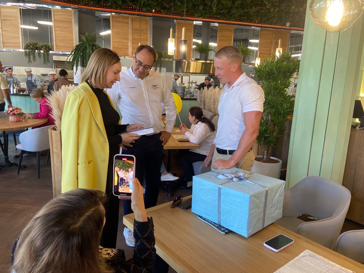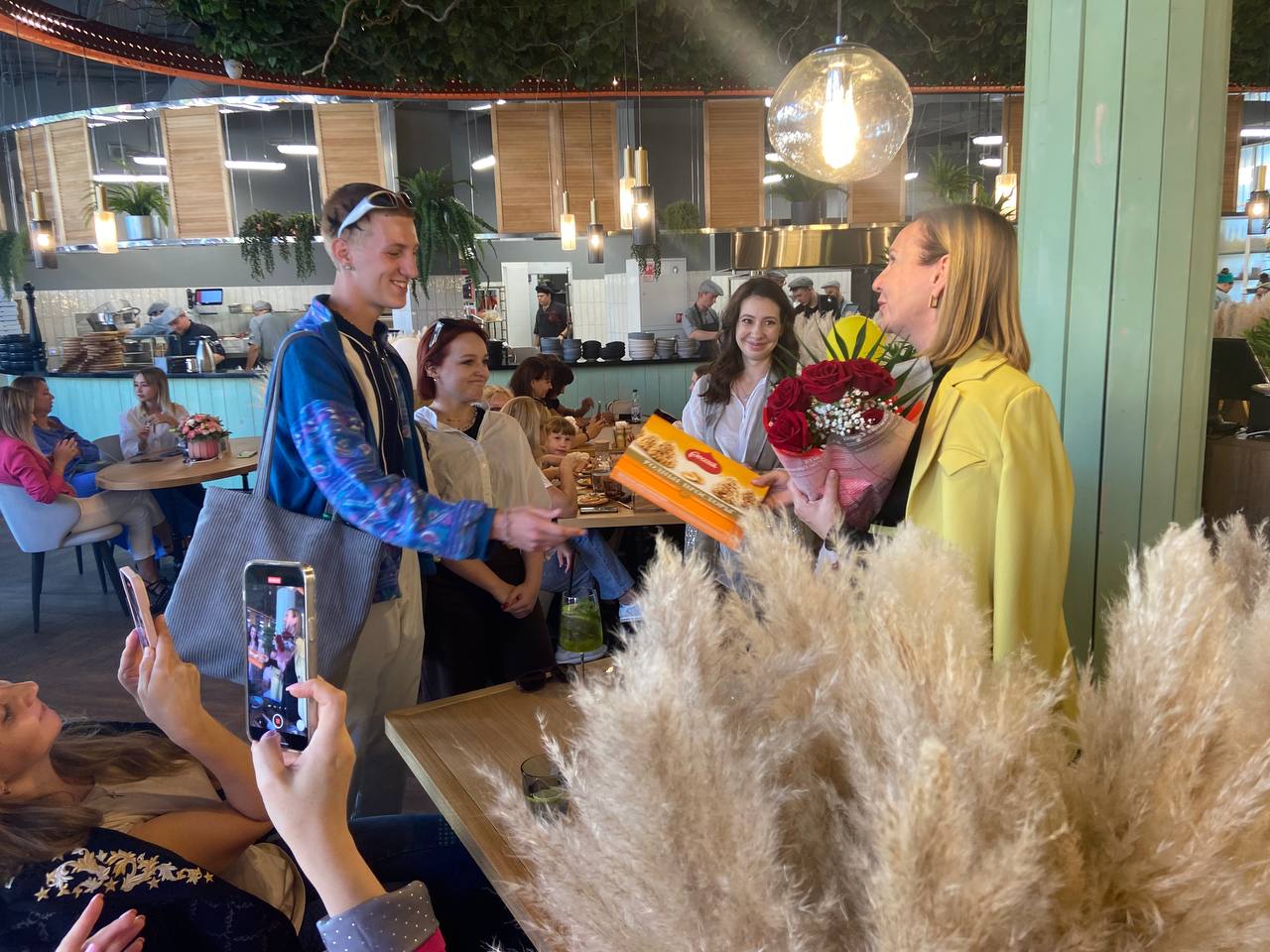 За столиком посередине зала расположились предприниматели - Елена Ежова и генеральный директор федеральной сети Элеонора Садилова. Ульяновская бизнесвумен на открытие надела ярко-желтый пиджак. Возможно, цвет был выбран неспроста. В этот день он мелькал по всему заведению, символизируя солнечную Италию. На протяжении дня Ежову поздравляли с открытием. Подарки дарила и она сама - 1 сентября отмечал день рождения управляющий сети фитнес-клубов «Ультра» Никита Елисеев.