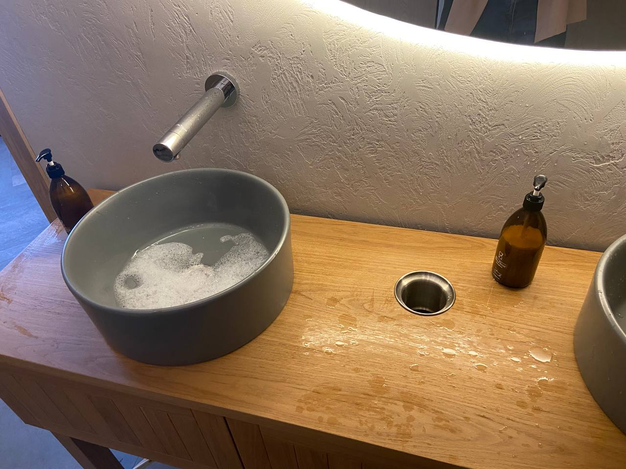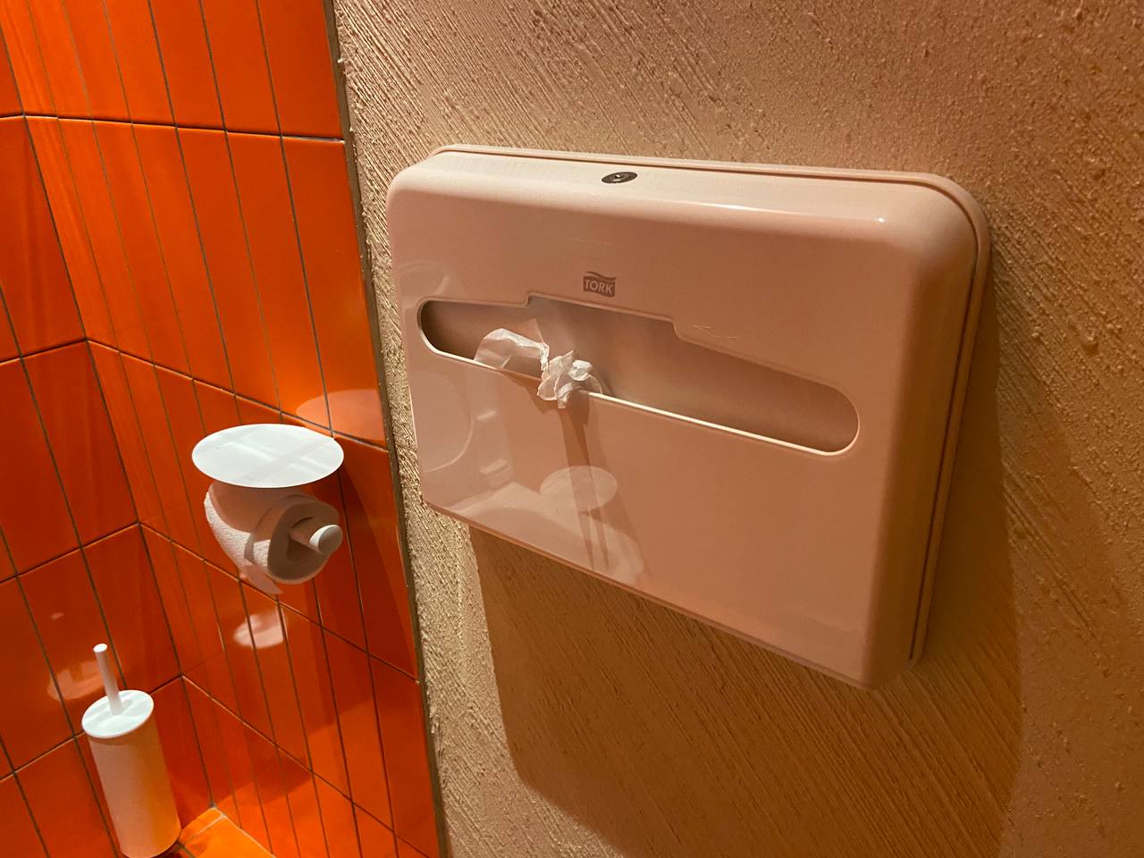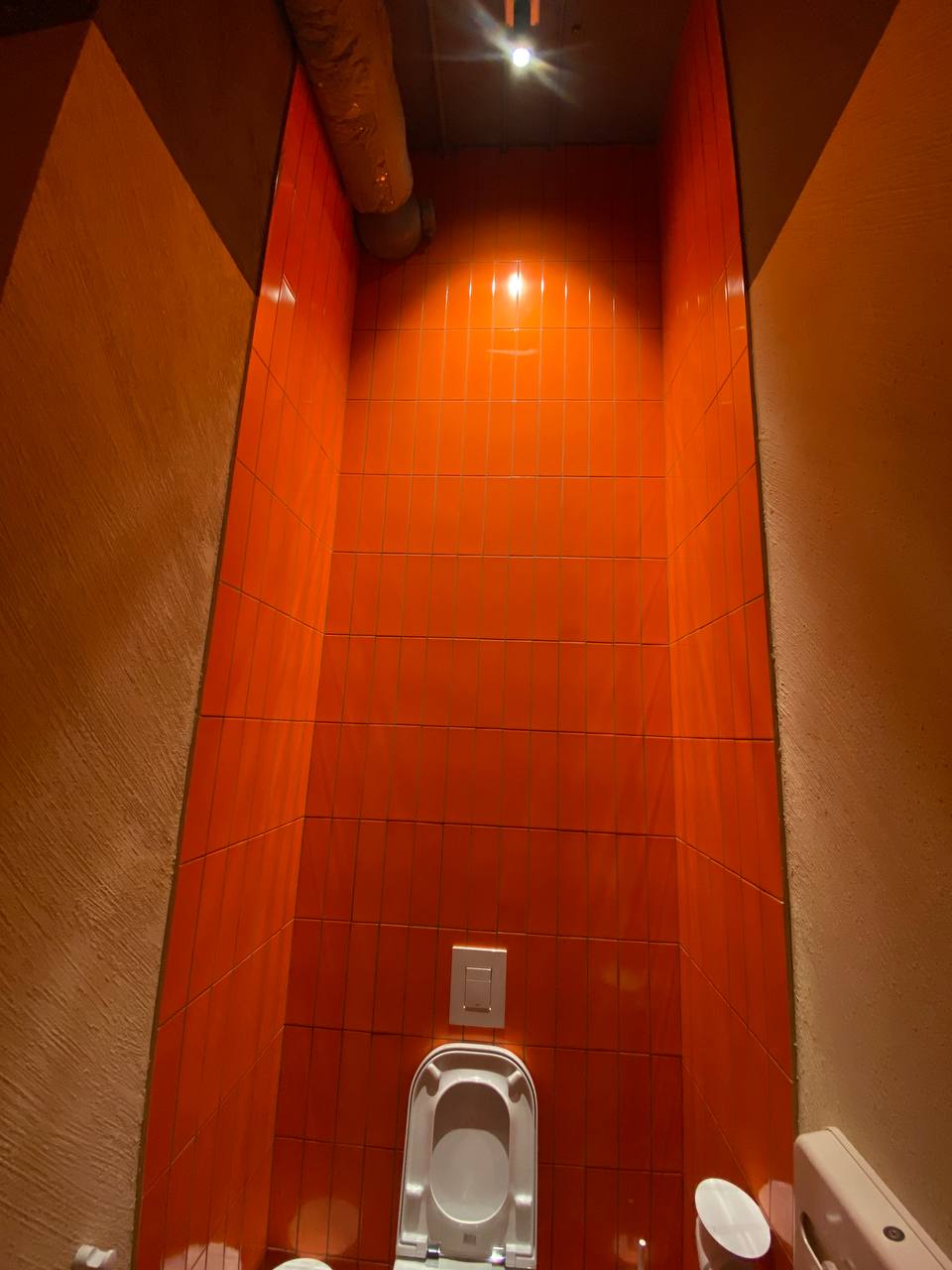 Заказ приняли в 13:14. Прошло полчаса, а блюда так и не принесли. Пока ожидали, решили проверить туалет. Он совмещенный, без двери. В тамбуре расположено две мойки с мылом и зеркалом. В шкафчиках - полотенца для рук. Ничего необычного, но сам туалет удивил. Всего три кабинки, за каждой из которых не просто унитаз, а целый трон. Ощущения вызывает странные...