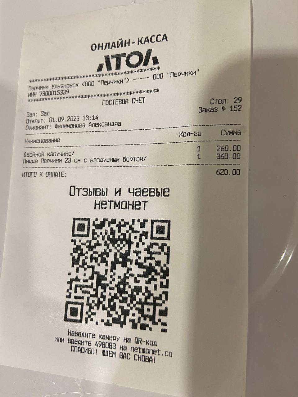 Фирменная пицца не показалась какой-то особенной. Обычная мясная. Бортики действительно пышные, но немного подгоревшие. Десерт понравился больше, нежный и сытный. Всего отдали 620 рублей, но настроение из-за ожидания подпортилось. В заведении пообещали, что все неполадки исправят. Плюсом оказалась милая надпись на коробке из под пиццы: «С любовью, Перчини».