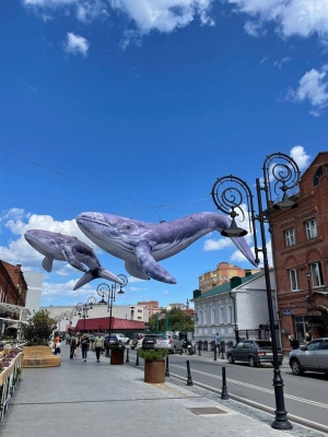 Сегодня сотрудники «Горзеленхоза» пригнали на улицу Федерации автовышку и заклеили дыру на боку надувного кита заплаткой – практически Айболиты!