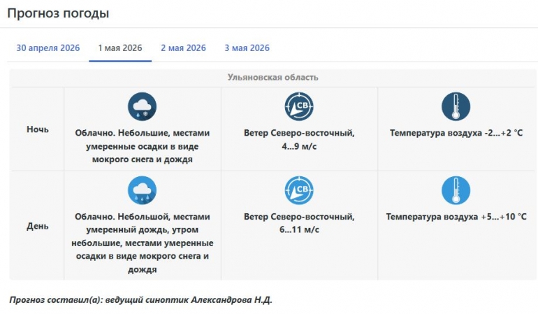 В ночь на пятницу, 1 мая, на территории Ульяновской области ожидается облачная погода. Пройдут небольшие, местами умеренные осадки в виде мокрого снега и дождя. Ветер станет дуть северо-восточный со скоростью 4 – 9 метров в секунду. Температура воздуха -2...+2 °C.