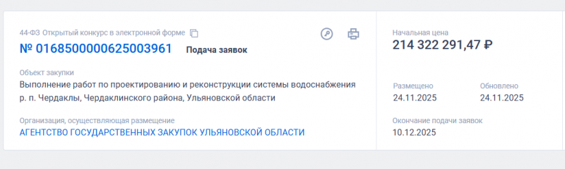 На портале ЕИС «Закупки» началась подача заявок на работы по проектированию и реконструкции системы водоснабжения рабочем поселке Чердаклы за 214,3 млн рублей.