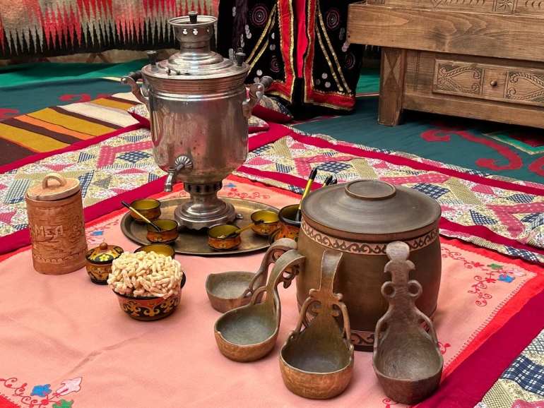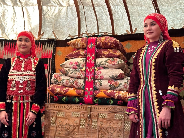 Затем гости пришли к юртам, которые привезли башкиры. Ехали они, кстати, 12 часов из Уфы на машине по снежным заносам. У нее деревянный каркас и собирается она довольно быстро. Например, в такой могла жить целая семья. Есть женская и мужская половины, место для детей.