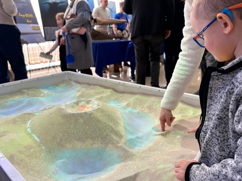 Здесь же интерактивная песочница дополненной реальности: ребята делают на песке свои рельефы и компьютер загружает реальность — появляются вулканы, текут реки, летают птеродактили. Рядом голова шерстистого носорога и раскрученный левосторонний аммонит.