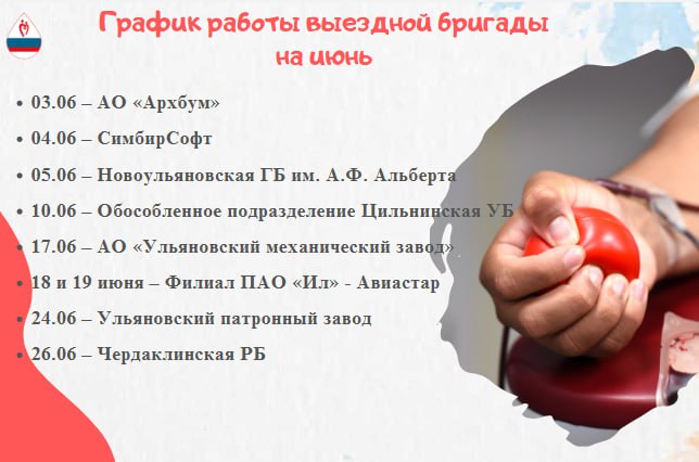 17 июня доноров примет Ульяновский механический завод, 18 и 19 июня - завод «Авиастар», а 24 июня - Ульяновский патронный завод. Завершится донорский марафон 26 июня в Чердаклинской районной больнице, где сдать кровь смогут все желающие.