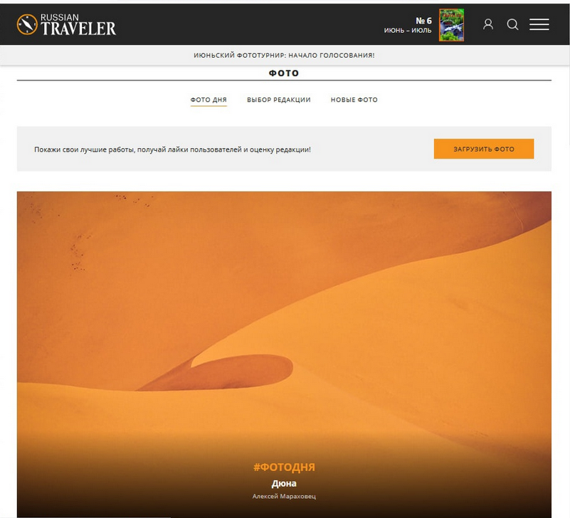 Об этом Алексей рассказал на личной странице в социальных сетях, опубликовав скриншот с сайта Russian Traveler со своей фотографией, которая называется «Дюна».