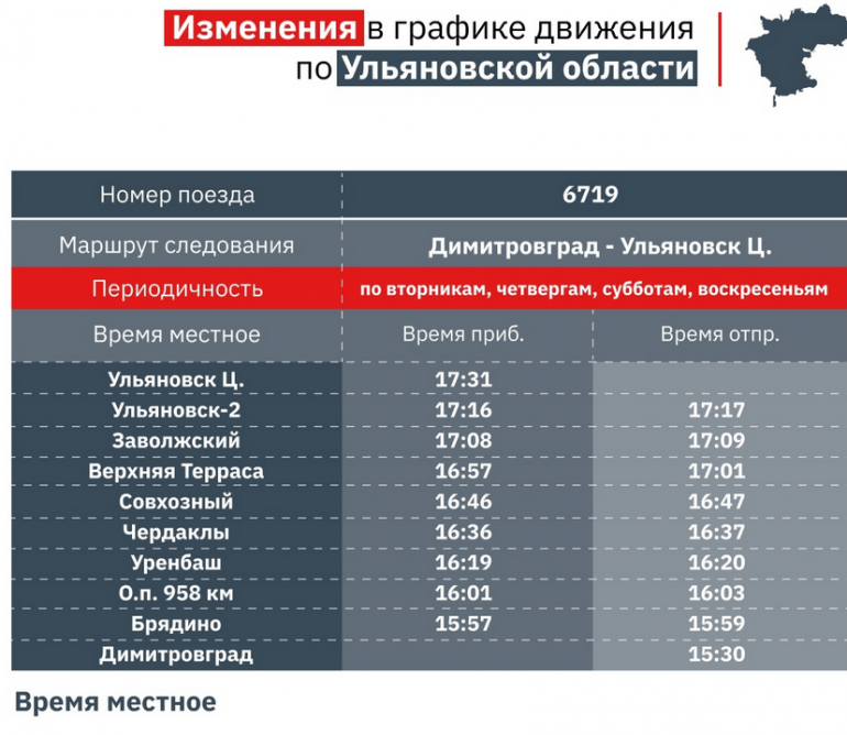 - Димитровград (отправление в 15.30) – Ульяновск Центральный (прибытие 17.31). Пригородный поезд курсирует по вторникам, четвергам, субботам и воскресеньям. Время местное, - сообщается в официальной группе Башкортостанской ППК.