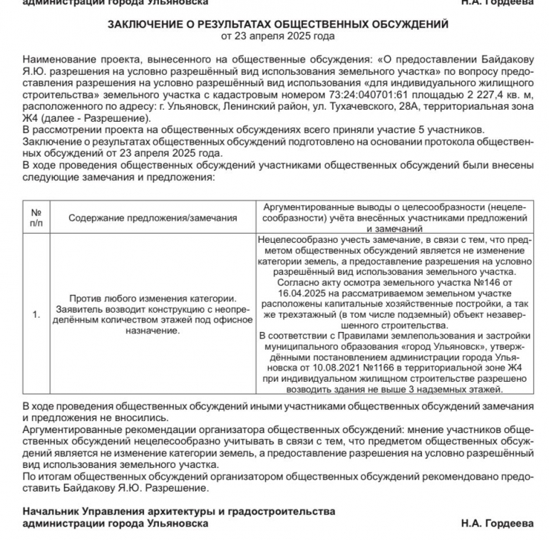 Заключение о результатах проведения общественных слушаний было опубликовано в официальной городской газете «Ульяновск сегодня». Согласно этому сообщению, обсуждения провели 23 апреля. На повестке стоял вопрос предоставить Ярославу Байдакову разрешение застроить участок площадью 22,2 «сотки» по условно разрешенному виду использования – для индивидуального жилищного строительства.