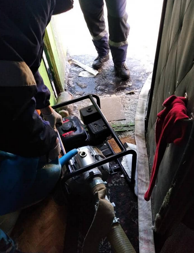 Возникла угроза замерзания системы отопления. Чтобы этого избежать, спасатели при помощи мотопомпы откачали восемь кубов воды из подвала.
