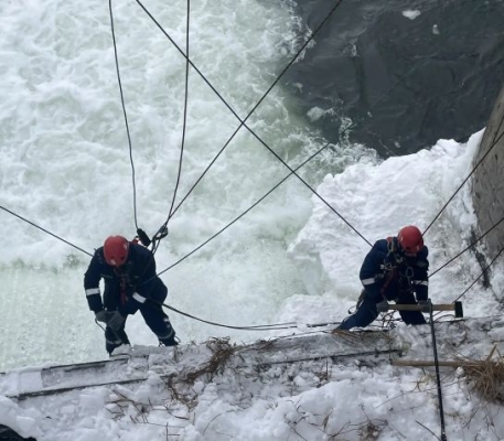 Свесившись с помощью альпинистского снаряжения у самого бьефа, спасатели, используя бензопилу, перфоратор, ломы, топоры и кувалды, разбили намёрзший за зиму на центральном затворе лёд.