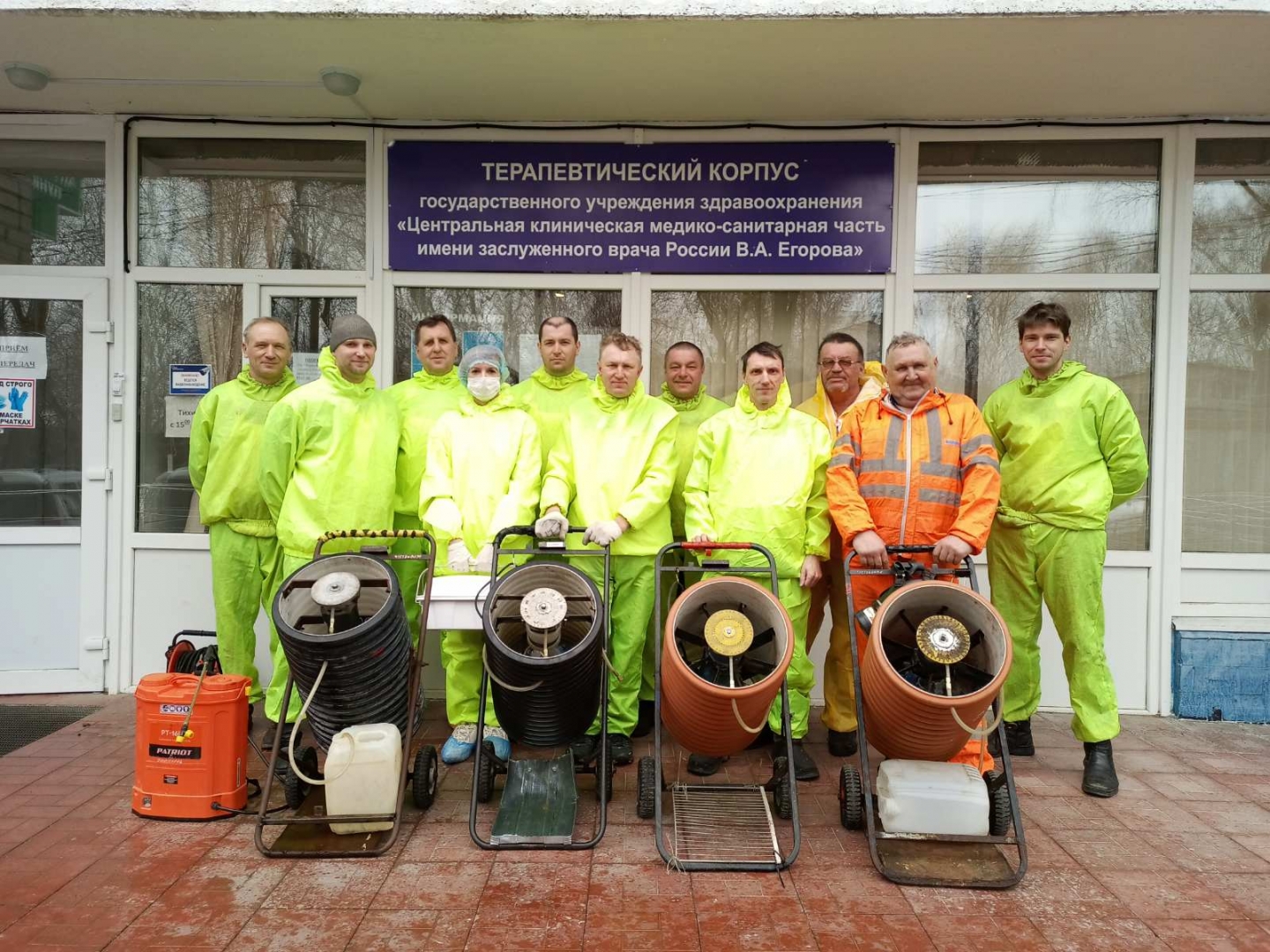 Следующим на очереди объектом работы спецотряда стал ковидный стационар в ЦК МСЧ им. Егорова. Дезинфекция проводилась на общей площади в 8000 квадратных метров.