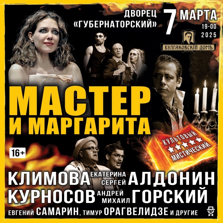 7 марта в 19:00 в ДДН «Губернаторский» (ул. Дворцовая 2/13) представит спекталь Театр им. М. А. Булгакова. Действие построено по принципу синтеза театрального искусства и элементов шоу: бешеный темпо-ритм, сменяющиеся мизансцены по принципу кинокадра, яркая визуальная форма, оригинальный сценарий.Зрительный зал и сцена превращаются в мистическое пространство, где зритель не знает, откуда появляются и куда исчезают герои. В ролях: Екатерина Климова, Сергей Алдонин, Андрей Курносов, Михаил Горский, Тимур Орагвелидзе, Изнаур Орцуев.