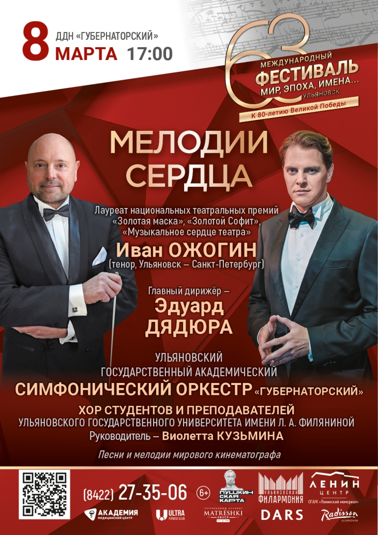 8 марта в 17:00 в ДДН «Губернаторский» (ул. Дворцовая 2/13) Ульяновский государственный академический симфонический оркестр «Губернаторский», главный дирижёр Эдуард Дядюра, солист — лауреат национальных театральных премий «Золотая маска», «Музыкальное сердце театра», «Золотой Софит» Иван Ожогин (тенор, Санкт-Петербург) и солисты филармонии исполнят праздничный концерт.