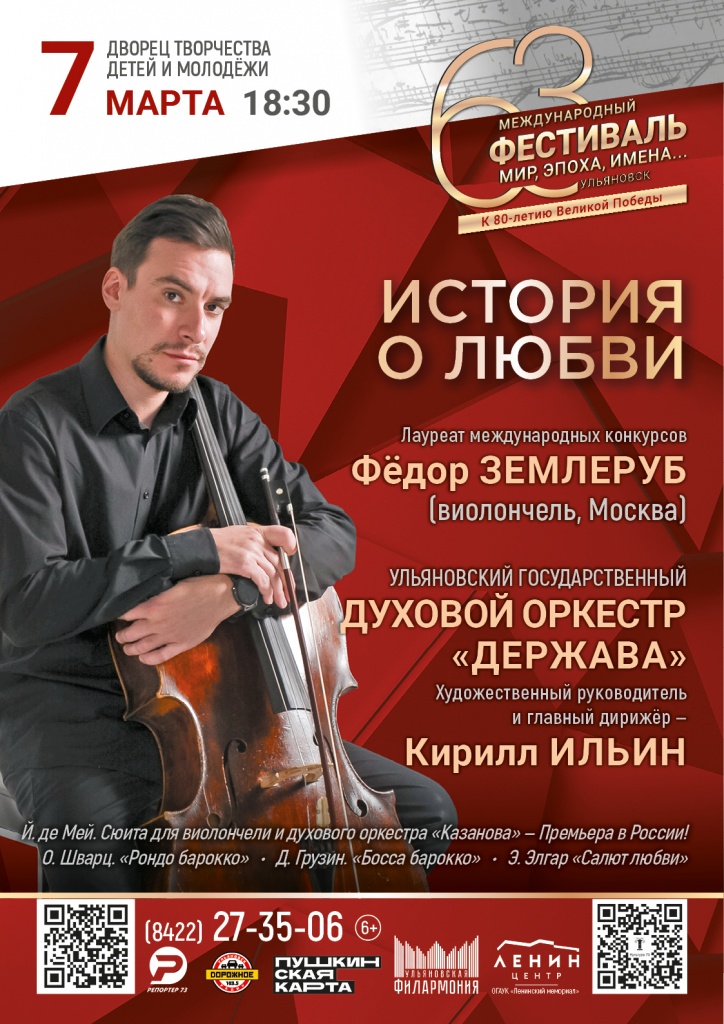 7 марта в 18:30 во Дворце творчества детей и молодёжи (улица Минаева, 50) выступает Ульяновский государственный духовой оркестр «Держава», художественный руководитель и главный дирижёр Кирилл Ильин и солист — концертмейстер группы виолончелей Государственного академического Большого симфонического оркестра имени П.И. Чайковского Фёдор Землеруб (виолончель, Москва). Состоится российская премьера сюиты «Казанова» для виолончели и духового оркестра в восьми сценах.