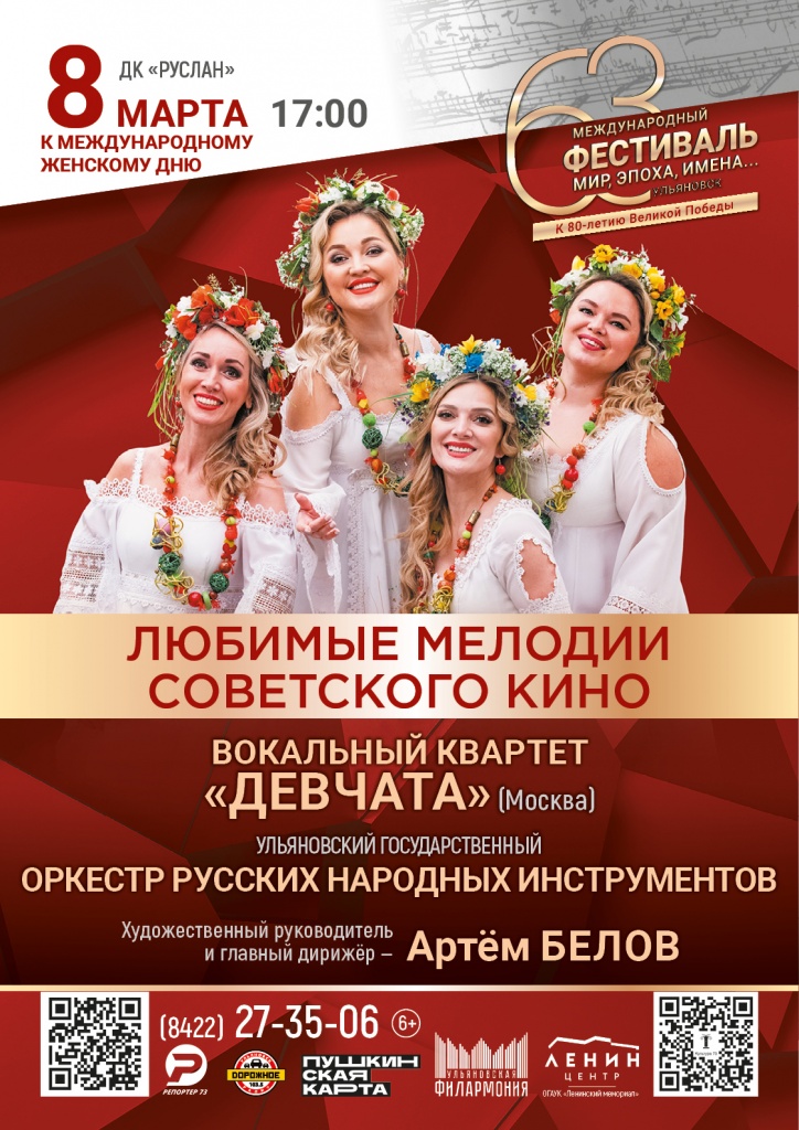 8 марат в 17:00 в ДК «Руслан» (улица 40-летия Победы, 15) выступает вокальный квартет «Девчата» (Москва) и Ульяновский государственный оркестр русских народных инструментов. В программу вошли лучшие песни советских композиторов 1950-60-х годов.