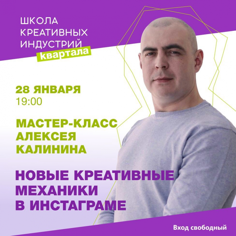 28 января в 19.00 в «Квартале» со своим мастер-классом «Новые креативные механики» выступит Алексей Калинин. Алексей расскажет про креативные механики, которые внедрял на протяжении 2021 года у себя в соцсетях, успешные кейсы, с примерами.