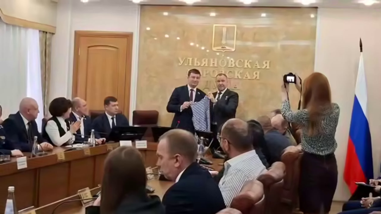 На девятом заседании ульяновской Гордумы спикер Илья Ножечкин получил тельняшку, которая побывала в космосе. Этот предмет станет новым экспонатом в музейной коллекции думы. Тельняшку вручал Герой России Олег Лобунец.