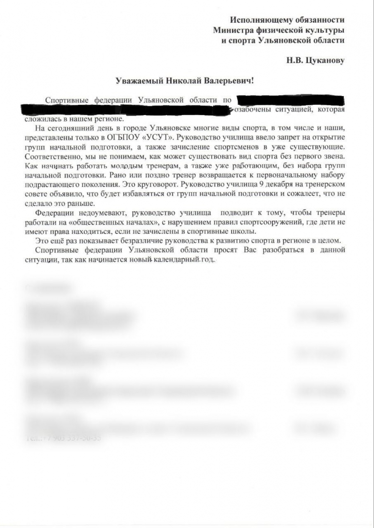 «На сегодняшний день в городе Ульяновске многие виды спорта, в том числе и наши, представлены только в ОГПБУО «УСУТ». Руководство училища ввело запрет на открытие групп начальной подготовки, а также зачисление спортсменов в уже существующие. Соответственно, мы не понимаем, как может существовать вид спорта без первого звена. Как начинать работать молодым тренерам, а также уже работающим, без набора групп начальной подготовки. Федерации недоумевают, руководство училища подводит к тому, что тренеры работали на «общественных началах», с нарушением правил спортсооружений, где дети не имеют права находиться, если не зачислены в спортивные школы», — говорится в обращении.