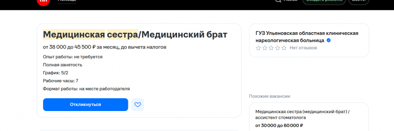 Не укомплектована и медицина. Конкурс — два резюме на место. Власти региона неоднократно отмечали острую нехватку акушерок и медсестёр. По данным «Росстата» зарплата у среднего медперсонала в области — 41 442 рублей. Однако на одном из агрегаторов вакансий нередки предложения в районе 39 тысяч после вычета НДФЛ. А то и меньше.