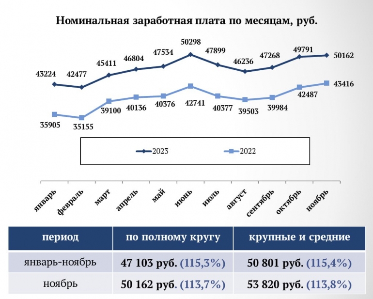 Так, средняя зарплата составила 47103 рубля, а темп её роста - 115,3% к 11 месяцам 2022 года.