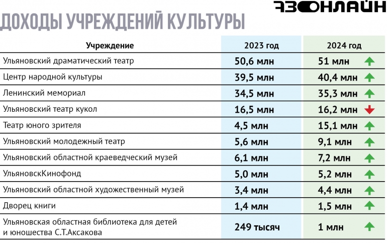 Список успешных учреждений возглавляет Ульяновский драматический театр имени Ивана Гончарова под руководством Натальи Никоноровой. В 2024 году доход учреждения составил 51 млн рублей. Он складывается из продажи билетов на спектакли и заработка от гастролей.