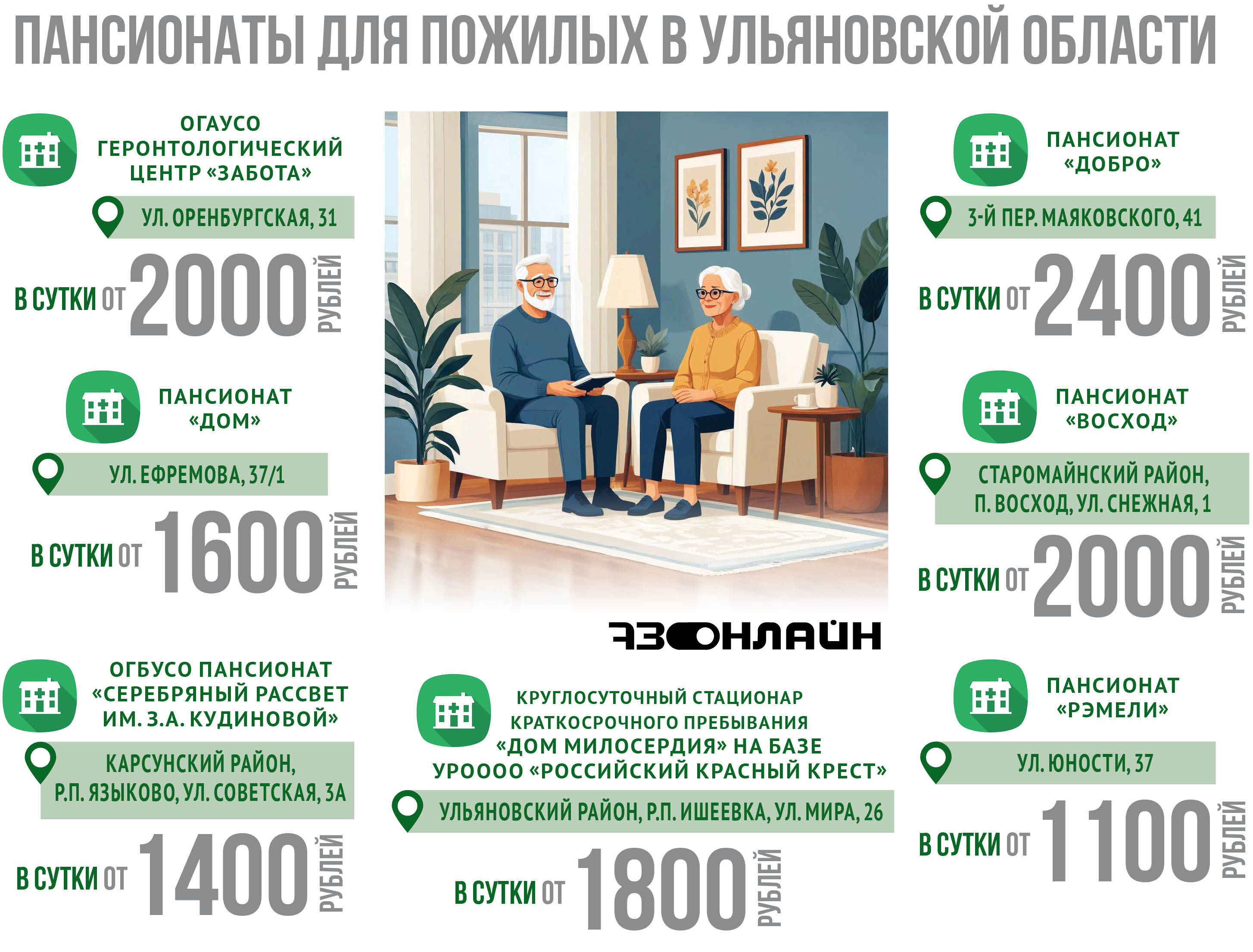 Полный перечень госучреждений для ульяновцев старшего возраста опубликован на сайте Министерства социального развития (реестр поставщиков социальных услуг). На момент публикации материала ни один частный дом престарелых не входит в данный реестр.