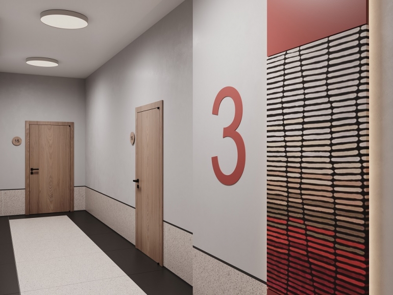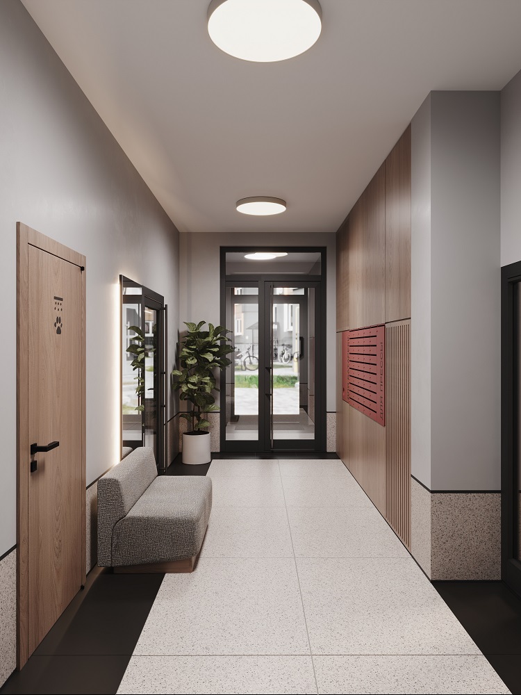 - Дизайнерские холлы с просторной колясочной и лапомойкой для питомцев.