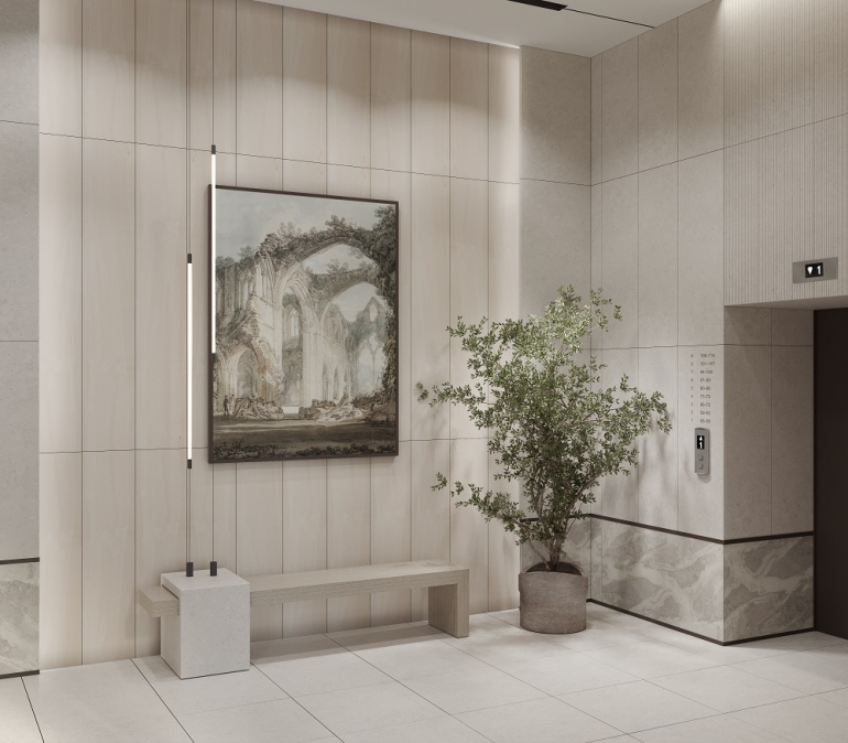 Проект предлагает более современные и эстетичные места общего пользования, которые в сочетании с архитектурой и благоустройством создают единый и завершенный образ.