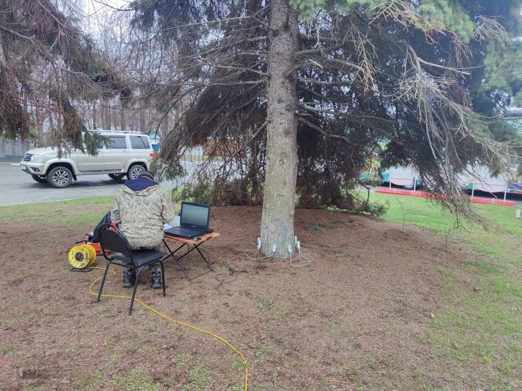 Сегодня, 22 апреля, в сквере на эспланаде они с помощью импульсного томографа «Арботом» диагностируют состояние елей, высаженных в 1969–1970 годах.