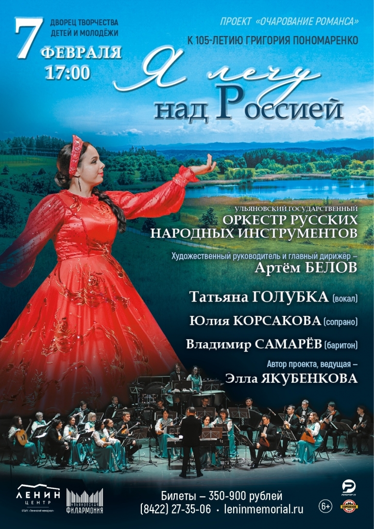 Ульяновский государственный оркестр русских народных инструментов посвящает очередную программу проекта «Очарование романса» песням Пономаренко. На вечере прозвучат воспоминания самого композитора, близких по духу людей — поэта Виктора Бокова, Людмилы Зыкиной, его музы — жены Вероники Журавлёвой, которая сегодня является директором и художественным руководителем Краснодарской филармонии, носящей имя Григория Пономаренко. «Оренбургский пуховый платок», «Тополя», «А где мне взять такую песню», «Цветёт черёмуха к похолоданию», «Осень в окошко стучится», «Эх вы, сани», «Шаганэ» и другие песни Пономаренко исполнят солисты Ульяновской филармонии Татьяна Голубка, Юлия Корсакова, Владимир Самарёв. Программу представит Элла Якубенкова.