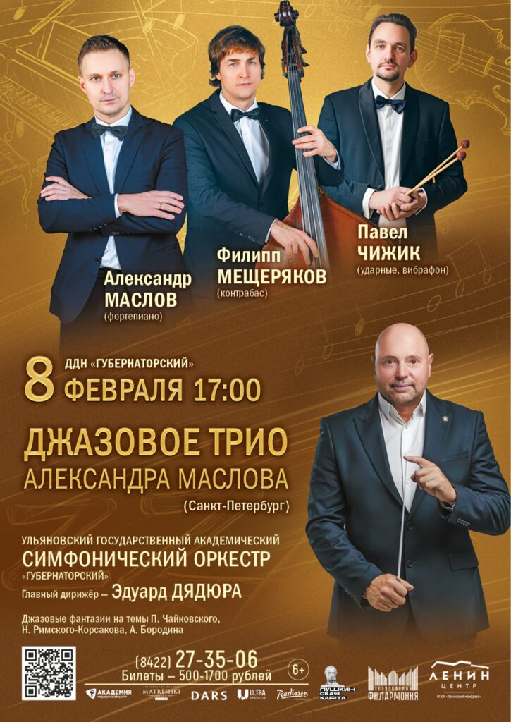 Коллектив известных петербургских музыкантов Трио Александра Маслова в составе Александр Маслов (фортепиано), Филипп Мещеряков (контрабас-соло), Павел Чижик (ударные, вибрафон) выступит с Ульяновским государственным академическим симфоническим оркестром «Губернаторский» под управлением главного дирижёра Эдуарда Дядюры.