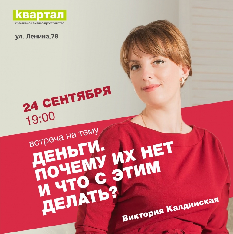 Также в пятницу в 19.00 пройдёт встреча на тему «Деньги. Почему их нет и что с этим делать?». Место: «Квартал» (выставочный зал), ул. Ленина, д. 78. Спикер Виктория Калдинская – проектный менеджер, тренер неформального образования, практикующий консультант по психосоматике. На занятии вы получите ответы на такие вопросы, как: почему порой не получается копить деньги, из-за чего вы влезаете в долги и кредиты, почему другие живут, а вы выживаете и т.д. Вход — свободные взносы. Количество мест ограниченно, запись обязательна по ссылке.