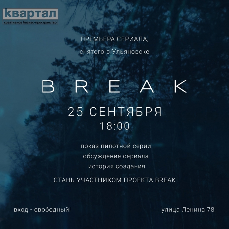 25 сентября (суббота) в 18.00 в «Квартале» состоится показ пилотного эпизода сериала «BREAK». После просмотра вас ждёт обсуждение с создателями и участниками проекта, история его создания, рассказ о тонкостях съемочного процесса. Вход свободный, но количество мест ограниченно.